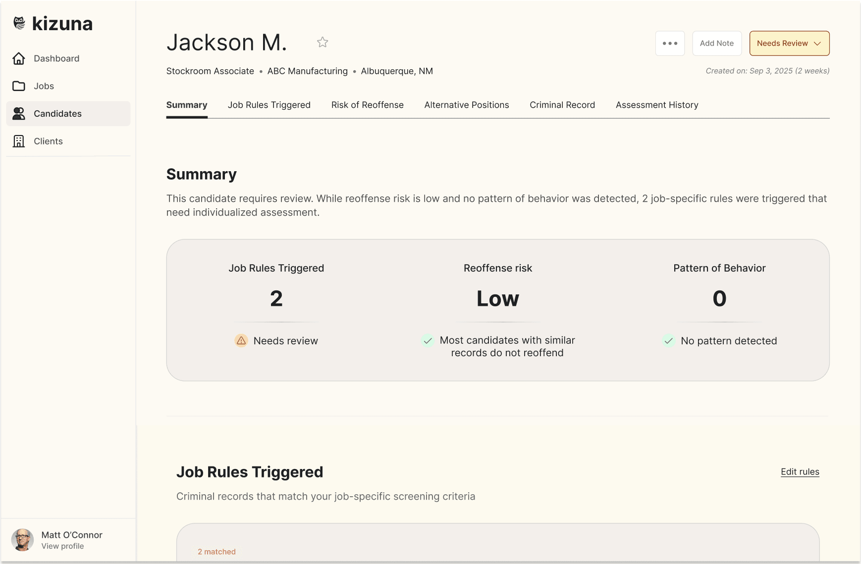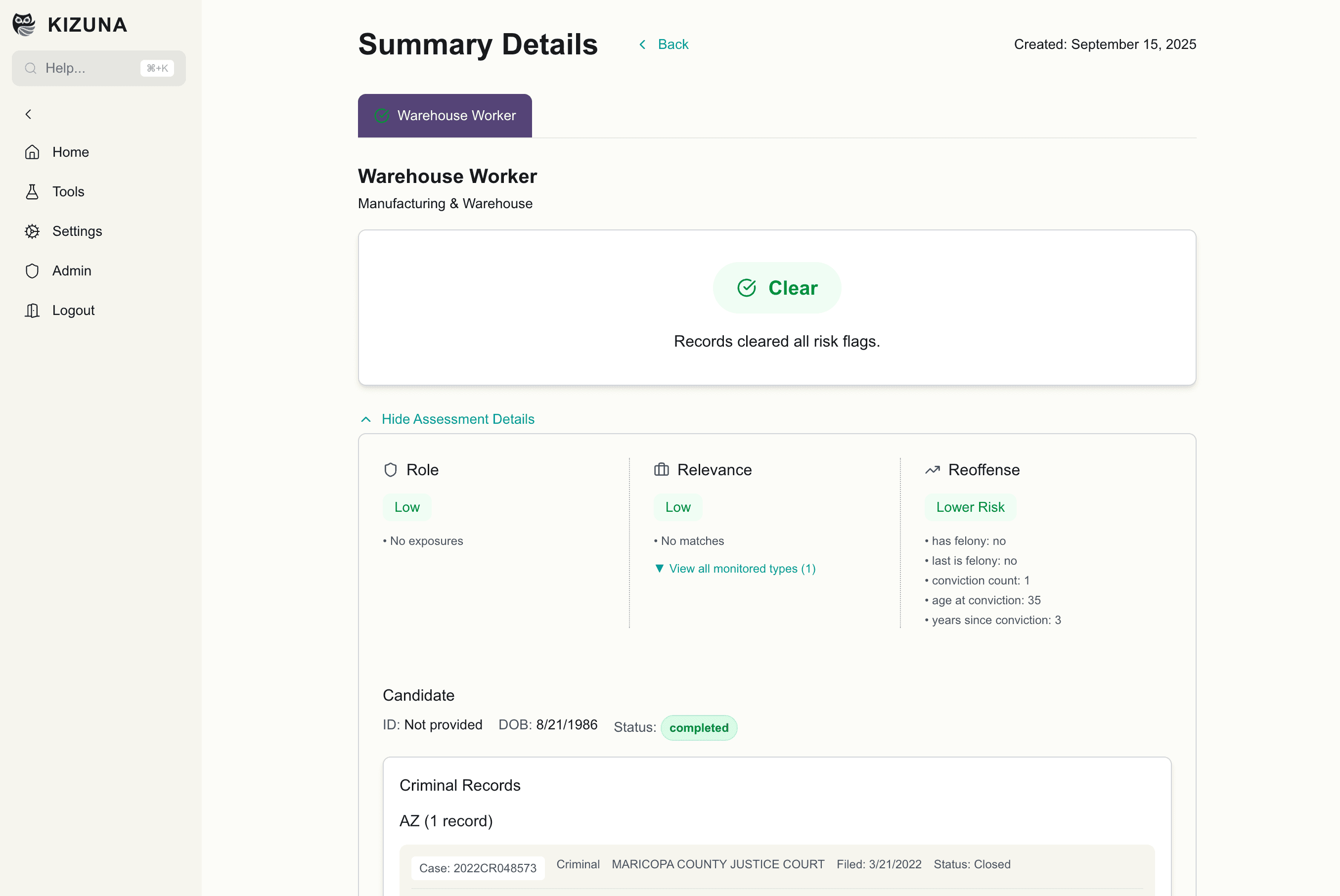 Our evaluation engine analyzes background reports against your criteria and research-backed risk models. It cuts through the noise, flagging only the issues that matter for you.